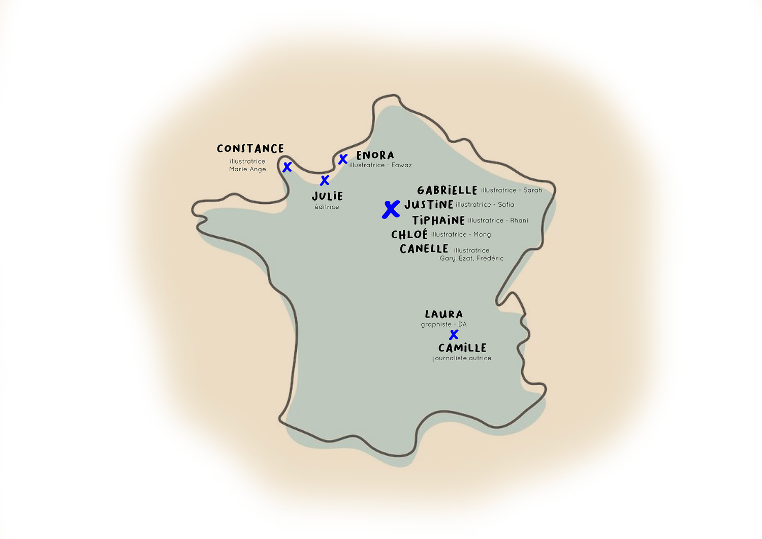 Regards d’ici et d’ailleurs se situe au croisement de nombreux chemins. Ceux des portraitisé.e.s, d’abord, qui se sont livrés au micro de Camille Elaraki. Elle-même à transmis les récits à sept illustratrices qui les ont colorés avec un talent toujours emprunt de leur personnalité singulière : Justine Hemery pour l’histoire de Safia, Constance André pour Marie-Ange, Gabrielle Siraudin pour Sarah, Chloé Bourdic pour Mong, Enora Tuauden-Bource pour Fawaz, Tiphaine Burguburu pour Rhani et Motus pour Gary, Ezat et Frédéric.